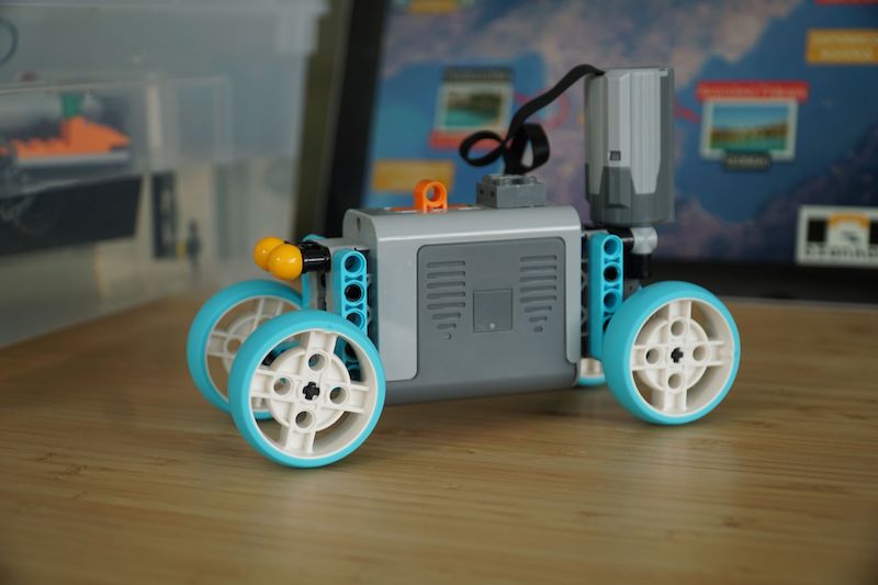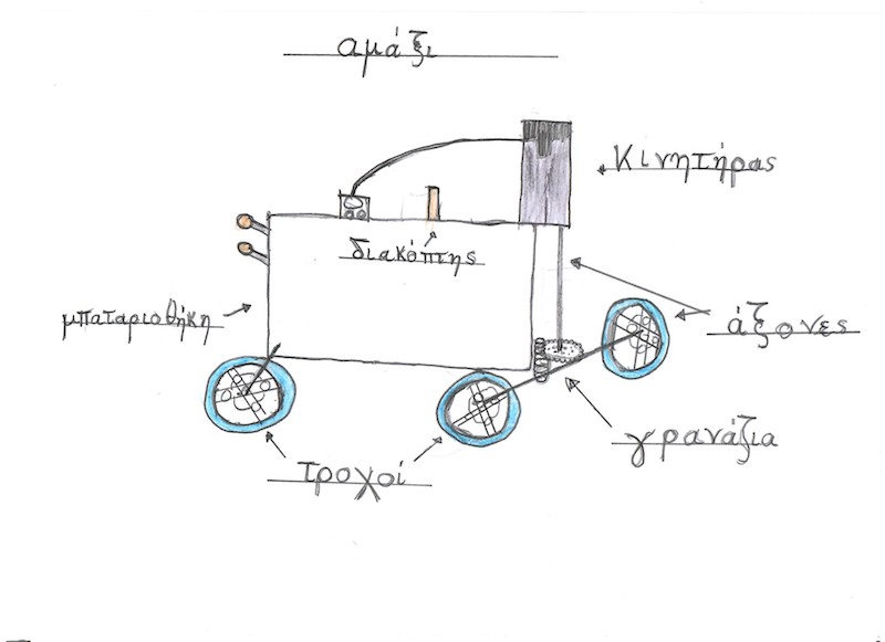 Ένα αυτοκίνητο, το οποίο διασχίζει κατά μήκος τη γέφυρα, όταν αυτή είναι ανυψωμένη στο επίπεδο της ξηράς. Η κατασκευή αποτελείται από κινητήρα, άξονες, γρανάζια και τροχούς. Η κίνηση από τον κινητήρα μεταφέρεται στους τροχούς με κάθετη σύνδεση των 2 γραναζιών και η φορά περιστροφής του κινητήρα καθορίζει την κίνηση του οχήματος προς τα εμπρός και προς τα πίσω αντίστοιχα. [1ος Μηχανισμός]