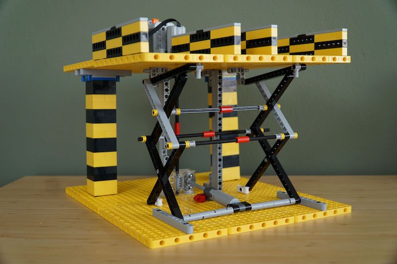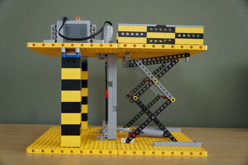 Μια βυθιζόμενη γέφυρα τέλος, αποτελούμενη από κινητήρα, άξονες, γρανάζια, μοχλούς και ατέρμονές κοχλίες. Η γέφυρα ανεβοκατεβαίνει με τη βοήθεια ενός ψαλιδωτού ανυψωτικού συστήματος που αποτελείται από 2 ζεύγη συνδεδεμένων μεταξύ τους μοχλών. Τη δύναμη στους μοχλούς ασκεί ένα γραμμικό έμβολο με ενσωματωμένη βίδα, ενώ η κίνηση μεταφέρεται από τον κινητήρα κάθετα με άξονες σε έναν ατέρμονα κοχλία, ο οποίος συνδέεται με ένα γρανάζι που αντιστρέφει τη φορά περιστροφής του κινητήρα και μπορεί να βιδώνει και να ξεβιδώνει το έμβολο, ανυψώνοντας και βυθίζοντας αντίστοιχα τη γέφυρα. [3ος Μηχανισμός]